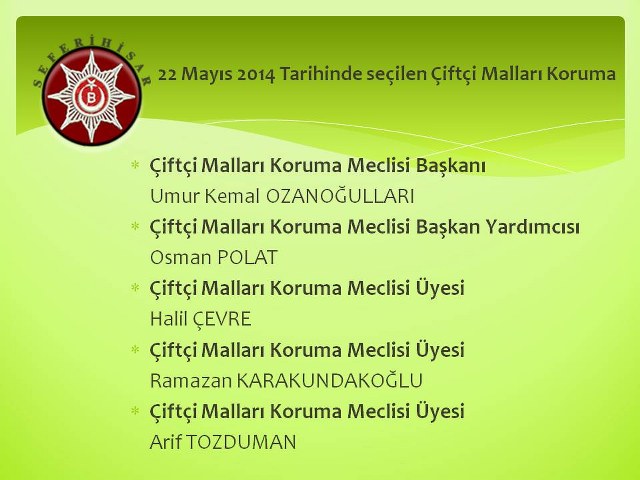 04.11.2014 Tarihinde Seferihisar Kaymakamı Sayın Resul ÇELİK, Seferihisar Belediye Başkanı Sayın Tunç SOYER, Seferihisar İlçe Tarım Müdürü Sayın Ali ÖZDEMİR ve Seferihisar Çiftçi Malları Koruma Meclisi Başkanı Umur Kemal OZANOĞULLARI ve Tüm Yönetim Kurulu Üyelerinin hazır olduğu Üyelerimizin, Çiftçilerimizin, Sayın Basın Mensuplarının ve Misafirlerimizin katılımı ile Çiftçi Malları Koruma Meclisi Başkalığının sorunlarına yönelik Toplantı gerçekleştirilmiştir.