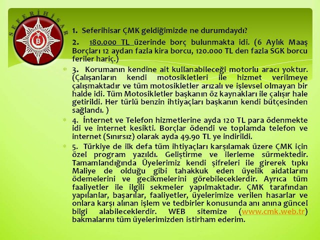 Bu acz içindeki durum ne Devletin bir Kurumu olan Seferihisar ÇMK ' ya nede haysiyetli bir şahıs veya Kuruluşa yakışmaktadır. Çözüm elzemdir.
